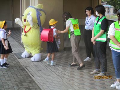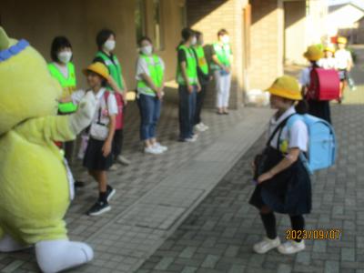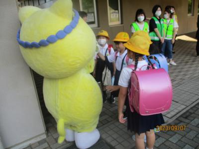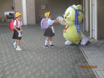 2023年9月7日 13時30分今年度2回目のPTAあいさつ運動が行われました。朝早くからPTAの役員のみなさんが玄関前に立ち、子どもたちにあいさつを呼びかけました。また、今回もにゃんたろうが応援に駆けつけてくれました。遠くから、にゃんたろうを見つけ、うれしくて駆け寄る児童の姿も見られました。暑い日が続きいますが、元気なあいさつが玄関に響き渡り、気持ちよく一日のスタートを切ることができました。