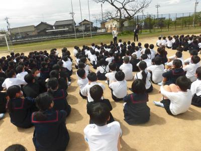 今年度1回目の避難訓練を行いました。調理室から火災が発生した想定で、全校児童が運動場に避難しました。自分たちの教室からの避難経路を確認するとともに、「オアシスモチ」(おさない、あわてない、しずかに、すばやく、もどらない、ちかづかない)の合い言葉を守りながら、素早く避難することができました。これからも命を守る訓練を実施して参ります。