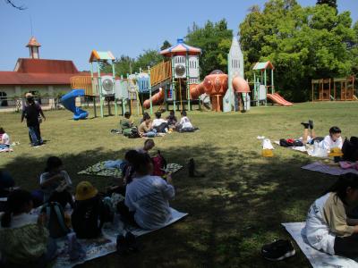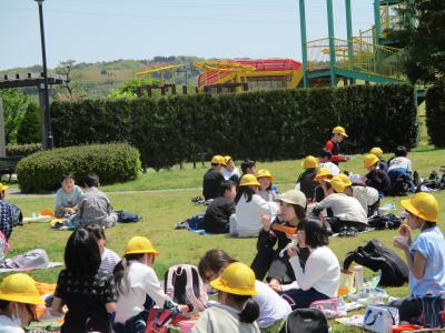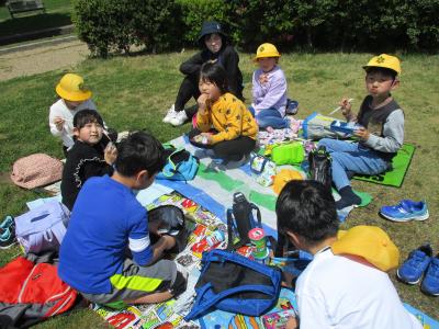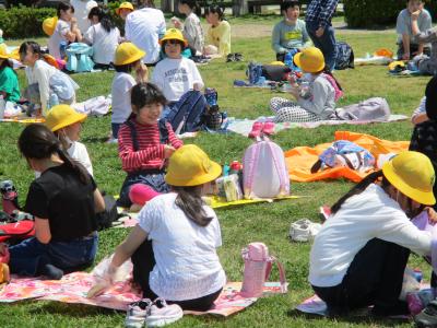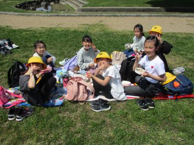 3、4年生は津幡町の条南公園です。津幡駅まで電車で移動し、公園に向かいました。距離は近かったですが、その分、公園内を走り回りました。どの子もおいしそうにお弁当を食べていました。