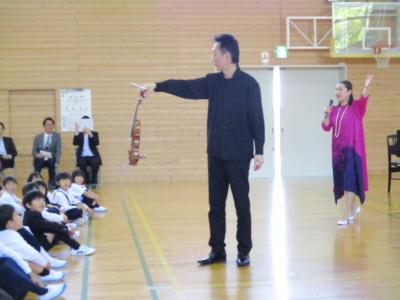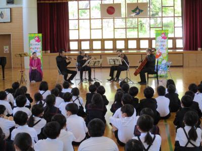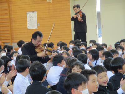 北國銀行さんのお世話で、オーケストラ・アンサンブル金沢の5名のみなさんをお迎えしてのコンサートが行われました。今回は、1~3年生を対象に10曲の演奏をして頂きました。定番のクラッシックからドラえもんの曲まで様々な演奏を楽しみました。また、アンサンブル金沢のみなさんの演奏に合わせて校歌も歌いました。最後には、ラデツキー行進曲に合わせて手拍子をしていると、団員のみなさんが、子どもたちの間に入り、間近で演奏をして下さいました。子どもたちの笑顔があふれるHAPPYコンサートとなりました。