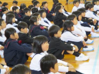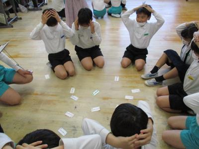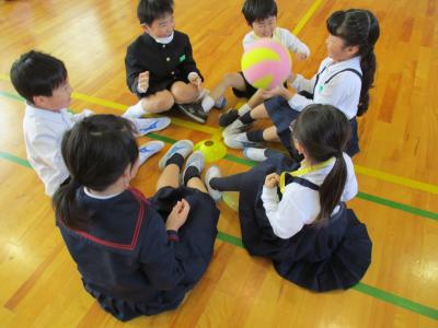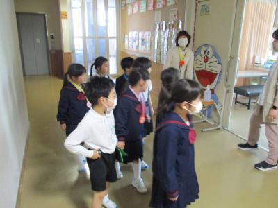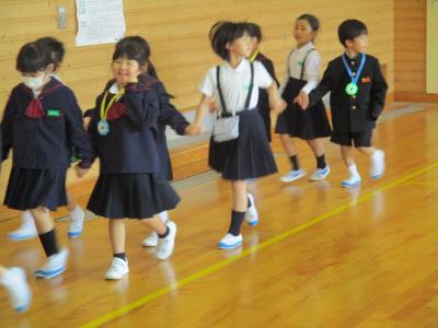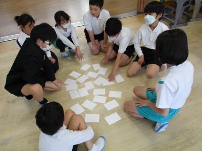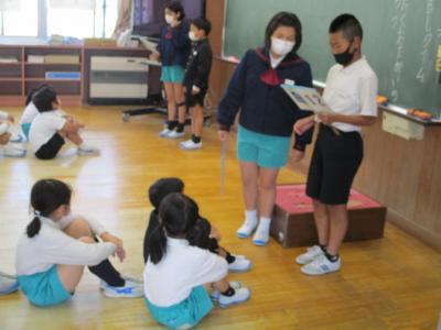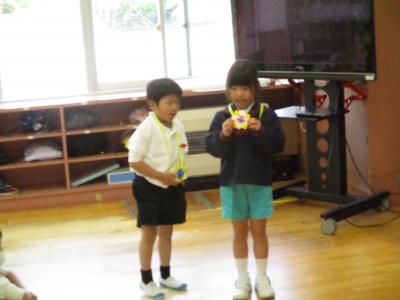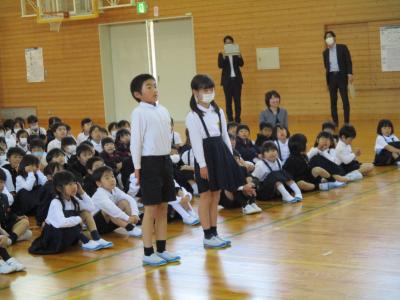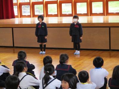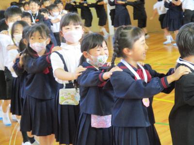 2年生の企画で1年生を迎える会が行われました。最初に、2年生から1年生に首飾りのプレゼンをが贈られ、1年生は嬉しそうにプレゼントを首に掛けていました。その後、1、2組に分かれて、学校探検と、集団遊びを行いました。学校探検では2年生が1年生のペースに合わせて歩き、それぞれの場所の説明を行いました。また、体育館では、ジャンケン列車やボール送りゲームを行いました。みんな仲良く笑顔で活動していました。最後に1、2年生それぞれから感想を話し合って終わりました。この会を通して、1年生と2年生がより仲良くなったことはもちろん、2年生の話し方、聞き方、姿勢は1年生のよいお手本となりました。
