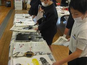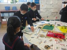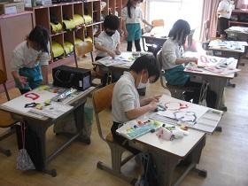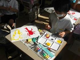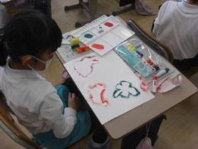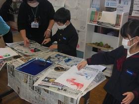 2年生が図工で版画に取り組んでいます。様々なモチーフを紙で切り抜き、インクを塗って白い画用紙にうつしていきます。だんだん絵がにぎやかになって楽しい雰囲気になっていきます。インクの扱いは大変ですが、鮮やかな色に目を奪われているようでした。