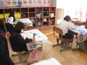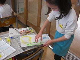 また、隣のクラスでは、版画に取り組んでいました。魚や昆虫などの姿を紙で切り抜き、絵の具を使って画用紙に写し取っていました。貼った切り抜きをはがせば同じ模様をいくつも作ることができ、工夫して仕上げていました。入学前、子ども園では、造形活動に力を入れている、と聞いていたとおり、子どもたちは、意欲的に次々に形を生み出していて、学びの成果が表れているようでした。