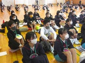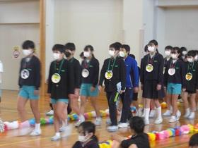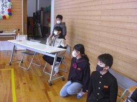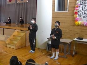 2022年2月18日 12時24分本日は、6年生を送る会を開催しました。開会式は5,6年生だけで行いました。他の学年は、出演時以外は、教室で中継で視聴しました。5年生は張り切って進行しました。6年生入場でもプラカードや花道を工夫してありました。6年生は、1年生が作ったメダルを首にかけて入場しました。開会式では、5年生の代表者が挨拶やめあてなどを力強く述べました。