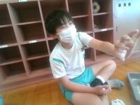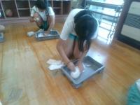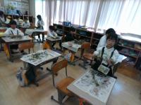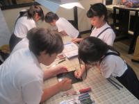 歴史体験教室を行いました。最初に、市役所の方にサポートしていただき、1学期に作った土器を焼き上げました。焼き上がったものは後日持ち帰ります。そして、石川県埋蔵文化センターの方に、縄文時代の石器、土器の実物を見せていただいたり、黒曜石で紙を切ったり、勾玉づくりを行ったりしました。