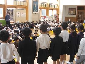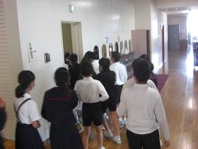 今月の避難訓練は、地震から火事が発生し、防火戸やシャッターが降りた状態で、安全に気を付けながらできるだけ迅速に避難することをねらいとして実施しました。シャッターなどが降りているため、いつも通っているところが通れないことで戸惑いや驚きを感じる児童も少なくありませんでした。少し時間がかかりましたが、みんな無事に避難することができました。