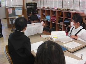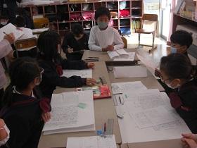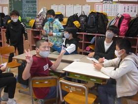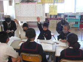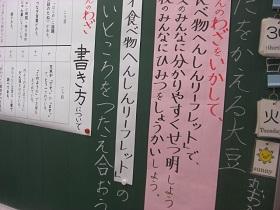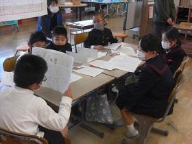2021年11月30日 11時23分3年生の国語では、「すがたをかえる大豆」という教材を読み、自分なりの「食べ物へんしんリーフレット」を作成し、みんなにわかりやすく説明する活動に取り組んでいます。このクラスでは、グループごとに聴き合い、書き方のよさについて意見を交流していました。学んだことを生かして、意欲的に話したり、感想を述べたりしていました。