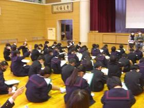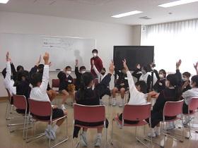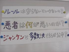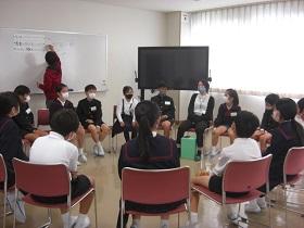 かほく市では、全小学校において5年生を対象とする「共通道徳」を実施しています。かほく市が生んだ偉大な哲学者である西田幾多郎博士にちなんだ小学生向けプログラムが記念哲学館主催で行われています。前回の哲学館見学に続き、本日は、「哲学対話」です。これは、対立的テーマに沿って司会者が参加者の意見をどんどん引き出していくもので、道徳の重点である「考え、議論する道徳」につながっています。2グループに分かれ、発言者が目印になるオブジェを持ちながら真剣な議論が行われていました。