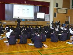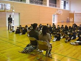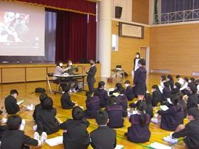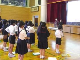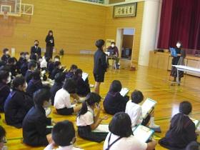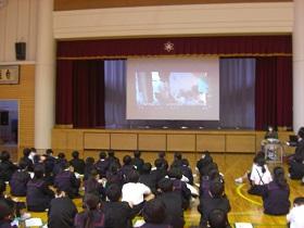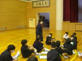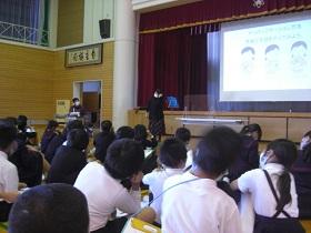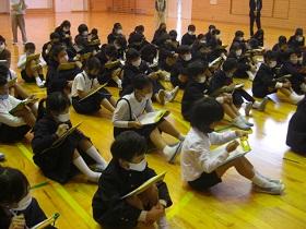4年生の福祉学習の2回目は、目の不自由な方との交流学習です。西さんと西さんの愛盲導犬であるウーノくんをお招きして、生活の様子について学習しました。最初に質問をさせていただいた後、階段を上り下りする様子を見学させていただいたり、日常の生活についてのビデオを視聴したりしました。西さんとウーノくんの息がぴったりで、お互いに支え合っておられる姿が印象的でした。児童には、様々な人との出会いを通して自分の生き方を見つめてほしいと願ってます。西さん、ウーノくん、ありがとうございました。