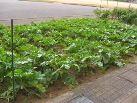 「畑の先生」駒井さんに教えていただきながら育てている2年生の大根が大きくなってきました。葉を大きく広げています。葉も食べられますが、一般に食用とされるのは白い根茎の部分で、どんどん太くなっています。収穫が楽しみですね。