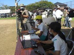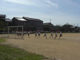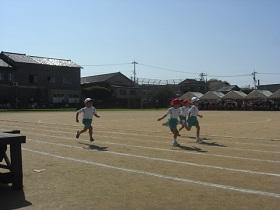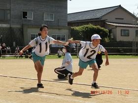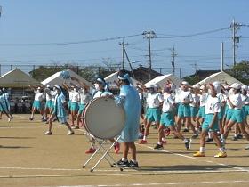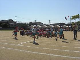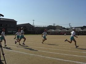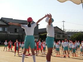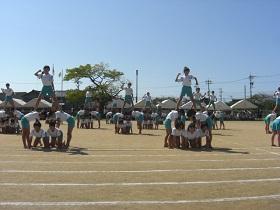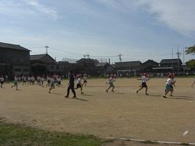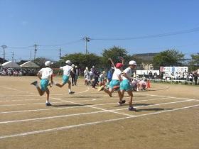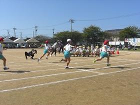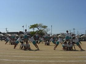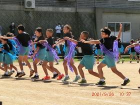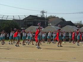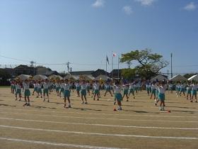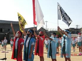 「認め合い、絆深めて、最後は笑顔」のスローガンを掲げ、応援合戦からスタートしました。児童は、元気いっぱいに、個人走や表現活動(ダンス・組み体操)リレーなどを行いました。テントの中も応援ムードいっぱいで、それぞれのチームの演技や走りを見つめ、ペットボトルにドングリなどを入れた鳴り物をたたいて応援しました。