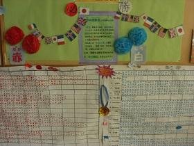 ひばりが丘図書館では、本の赤白対抗運動会を開催中です。縦割りグループごとに読んだ冊数をシールで表示していきます。今月は、体も頭も動かしてみんなよくがんばっています。
