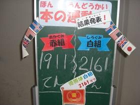 9月に実施した赤白対抗「本の運動会」が終わりました。結果は、赤組1911点、白組2161点で、白組の優勝でした。これからも秋の読書を楽しんでくださいね。