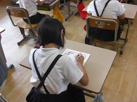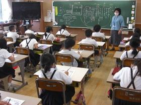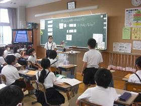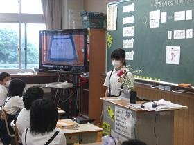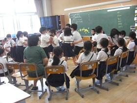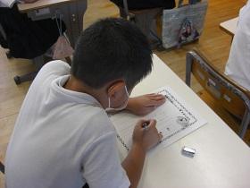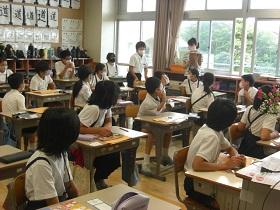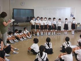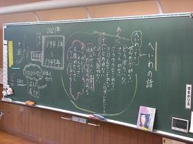今月は、各学年で平和について考える学習を行っています。今日は、2年生の教室で戦争についての話を聞き、平和について意見を出し合いました。児童は、自分なりの平和な世界について意見をまとめて書いていました。