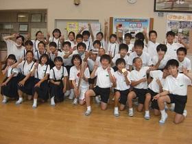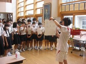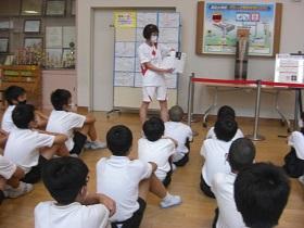 聖火トーチ展示2日目の昨日、聖火リレーランナーの末吉さん(大海小教諭)が放課後特別に来校してくれました。末吉さんは、本校にも勤務経験があり、そのとき今の6年生を担任されていました。その関係で6年生を前に、オリンピックへの思いについて語っていただき、その後、記念写真を撮りました。短い時間でしたが、よい記念になりました。