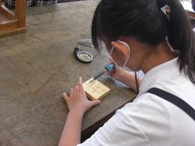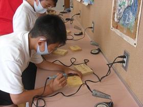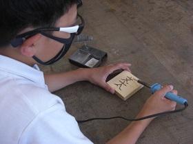 今日の環境委員会活動では、先日植え替えを終えたコミスク花壇の花苗に張り付ける、名前の板を焼きごてで作りました。指導していただいたのは、近谷さんです。様々な工芸に趣味をお持ちの方です。木片に花の名前や自分の名前をこてで焼き付けていきます。慣れないうちは思うような線が描けませんでしたが、だんだん上手になってきて完成しました。