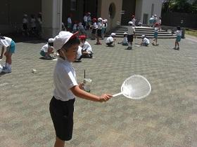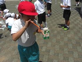 1年生が、様々な道具を使って、シャボン玉を飛ばしました。ハンガーやうちわ、ストローなどで試していました。一度にたくさんできるものがあれば、大きな玉を作りやすいものなどいろいろでした。シャボン玉が舞い上がると、歓声が沸き起こっていました。