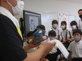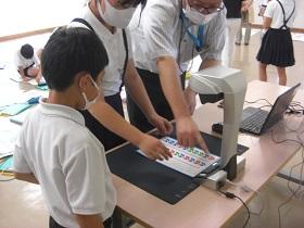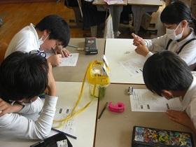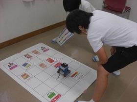 昨日と今日は、4年生のプログラミング学習です。PFUの方を講師にお招きしました。今回は、シールを使ってロボットに指令をプログラミングし、指示通りのコースで動くかどうかを実験しました。まず、ロボットが動くルートを決め、それに合わせて方向転換を示すシールを貼り、スキャナーで読み込んだ後、入力されたチップをロボットに差し込むという手順です。児童は、試行錯誤しながら買い物ロボットを使って指示通りに動かせるようがんばっていました。