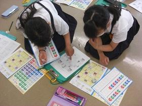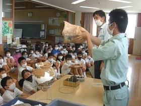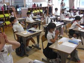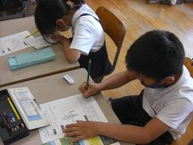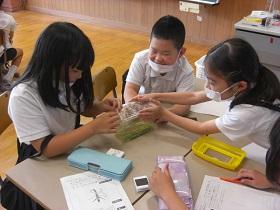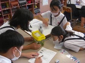 3年生では新しく理科の学習が始まっています。この日は、3年生がバッタを観察していました。体の仕組みをスケッチし、昆虫の体の特徴を調べました。子どもたちは、自分でいろいろな種類のバッタを捕獲し、草を入れて飼育しています。怖がらずしっかりと観察しています。