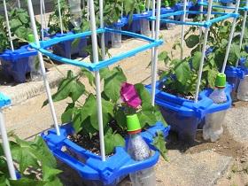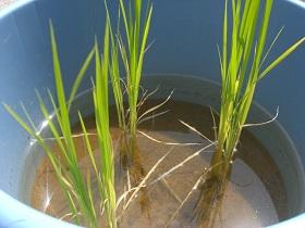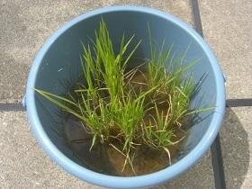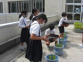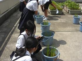 今年はバケツに入れて育てている5年生の稲は、随分と大きくなりました。畑ではありませんが、教室の近くにあるため、いつでも観察しやすい状態になっています。5年生は、その都度生育状況を記録しています。