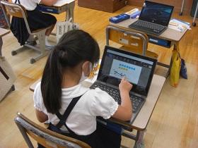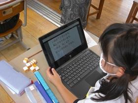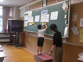 1年教室では、算数科の研究授業が行われました。先生がたくさん見ている中で、張り切って引き算の学習をしました。前に出て説明したりすることもできました。最後には、タブレットを使って、先生からメールで送られた練習問題に取組み、直接画面に回答しました。まだ操作には時間がかかりますが、みんなよくがんばっています。