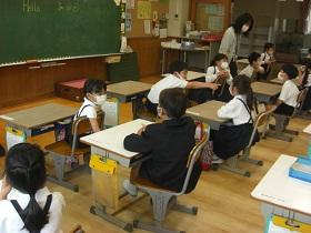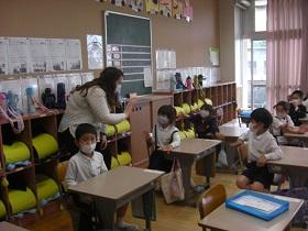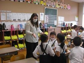 かほく市では、1,2年生は、ALT(英語などを母国語とする指導者)を通して外国語に親しむ活動を行っています。(年10時間程度)今日は、ローラ・マリー先生と1年生が、挨拶と自己紹介について学習しました。「Hello !」「my name is~」など楽しそうに会話をしていました。