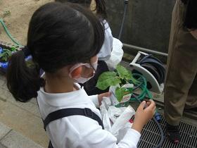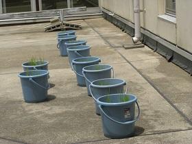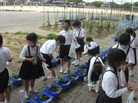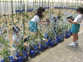 野菜、花、稲など本校で育てられている植物も気候に合わせるようにどんどん大きく成長しています。野菜は早くも花から実を付けはじめ、アサガオも大きく葉を広げています。稲は、バケツの高さを超えるようになりました。