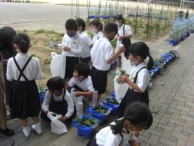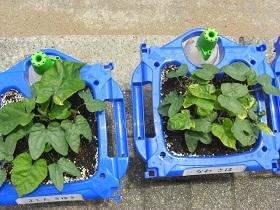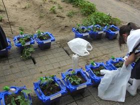 1年生のアサガオがたくさん芽を出したので、大きな花を咲かせるために一部を間引きしました。抜いた葉を牛乳パックに植え替えて今日持ち帰りました。ご家庭でも育てていただき、夏に涼しげな花を鑑賞していただければと思います。