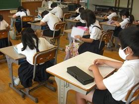 児童は、タブレット使用にもずいぶん慣れてきたようです。この日、3年生ではドリル学習、2年生ではミニトマトの成長観察記録にと使っていました。それほど迷うことなく自然に使っている様子が見られ、慣れてきていることがうかがえます。
