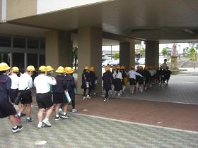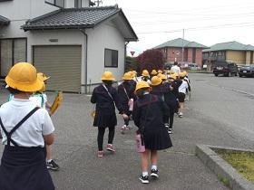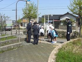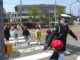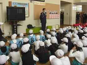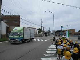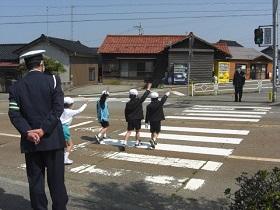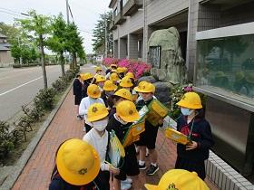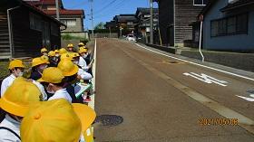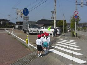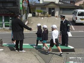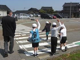 今日は、1,2年生の交通安全教室を開催し、津幡署交通安全課、交通安全推進隊、かほく市防災対策課の皆様にお越しいただきました。交通安全の啓発ビデオを鑑賞した後、外に出てモデルコースを歩きながら、安全な歩行についてご指導していただきました。さわやかな気候のもとで、児童は、信号や、立ち止まって左右の確認、手をあげての横断など、大切なことを再度確認しながら歩きました。