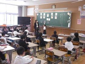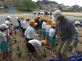 2年生は、生活科で野菜を育てます。今日も駒井先生を迎えて、野菜の苗の植え付けを行いました。なす、ピーマン、きゅうり、ミニトマトの苗を畝に沿って植えます。穴を掘って、水を入れて、ポットから慎重に苗玉を外して土を固めてまた水をやりました。どの児童も嬉しそうに活動していました。「ピーマンは好きですか?」と尋ねるとたくさんの児童が「好きで~す」と答えてくれました。これから水やりを毎日行っていきます。収穫が楽しみですね。いい体験ができそうです。