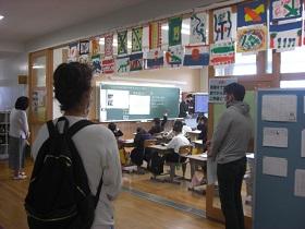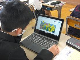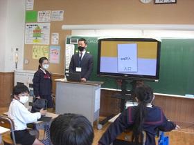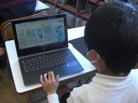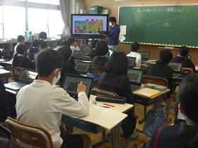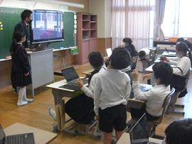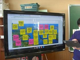 4月から、一人一台タブレットを活用した学習を進めています。タブレットを活用して情報収集や分析をして、自分の意見を発表したりすることができるようになってほしいと考えています。この日は、4年生、5年生のクラスで社会科の授業で活用しました。4年生は、都道府県クイズを作成してヒントを提示していました。5年生では、低地の人々のくらしについて、写真から思いついた疑問を入力し、リアルタイムで画面に映し出されるみんなの疑問を確認しながら学習していました。