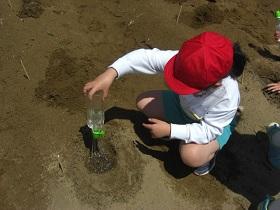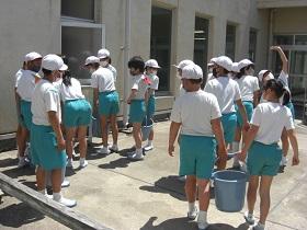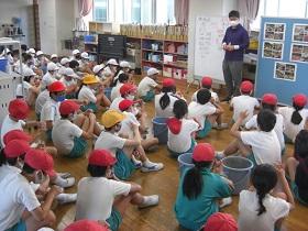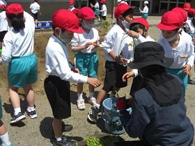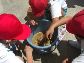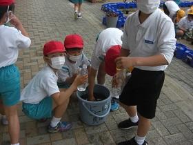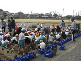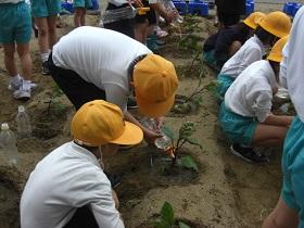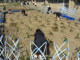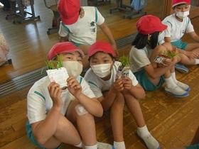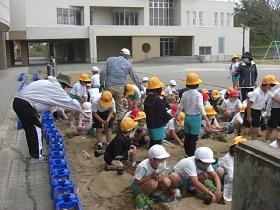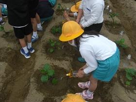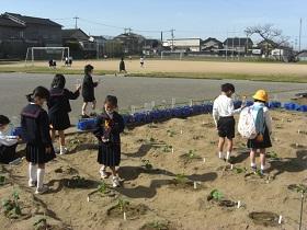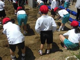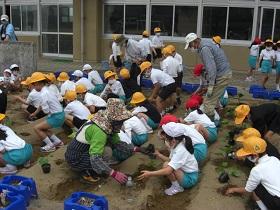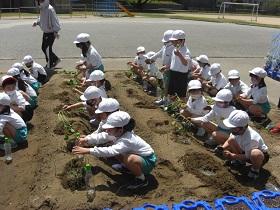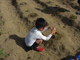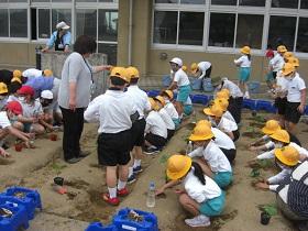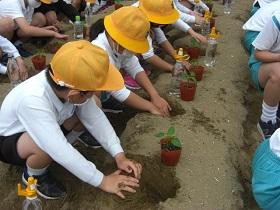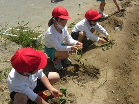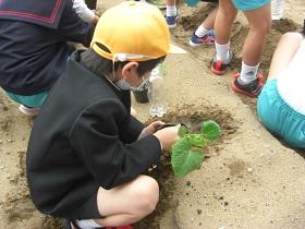 1年生は、アサガオに続いて、サツマイモの収穫をめざして、苗を植えました。はじめに苗床として穴を掘り、水をたっぷりしみこませた後、苗を寝かせるように植えました。土をかぶせてさらに水をやりました。高松は、砂地でサツマイモ栽培にはちょうどよい土壌ですが、その分水はしみこみやすく、水やりも毎日必要になります。これからアサガオと併せてがんばりましょう。