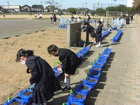 2021年5月11日 15時04分1年生は、アサガオに続いて、サツマイモの収穫をめざして、苗を植えました。はじめに苗床として穴を掘り、水をたっぷりしみこませた後、苗を寝かせるように植えました。土をかぶせてさらに水をやりました。高松は、砂地でサツマイモ栽培にはちょうどよい土壌ですが、その分水はしみこみやすく、水やりも毎日必要になります。これからアサガオと併せてがんばりましょう。