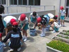 1年生はアサガオ、2年生は野菜を育てています。この時期は、毎日水やりを行います。ペットボトルを使ってたっぷり植物に水をあげています。しばらくするとアサガオも芽を出し、野菜も葉を広げます。大きく育ってほしいと願いながら水やりをがんばります。