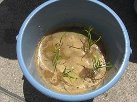 今年の5年生総合「米作り」は学校田ではなく、バケツを使って行うこととしました。今日は、土を集め、水を入れて、小さなバケツ水田を作りました。そこへ、苗を植えていきました。広い田んぼで田植えができればよかったのですが、コロナ禍における小さな工夫です。