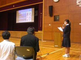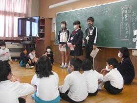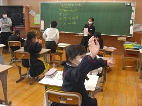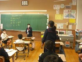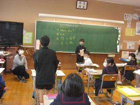 3年生では、コミュニケーションの方法として、英語でクイズ大会を行っています。各自で当ててほしいものを決め、ヒントを出す形式です。第1~3ヒントを出して答えてもらいます。動物など様々なものについてポスターを出しながら英語を使ってクイズが出され、正解したときには歓声が上がっていました。