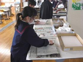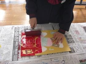 2021年3月8日 18時07分3年生が版画作りに取り組んでいました。彫った原版に鮮やかな塗料を塗って、紙をあて、裏からごしごしこすってめくります。芸術作品が揃いました。