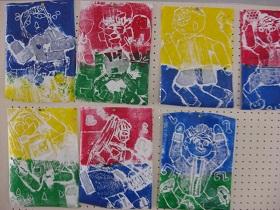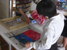 3年生が版画作りに取り組んでいました。彫った原版に鮮やかな塗料を塗って、紙をあて、裏からごしごしこすってめくります。芸術作品が揃いました。