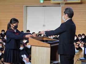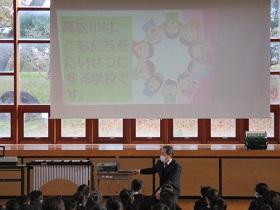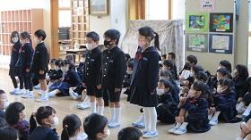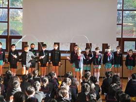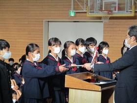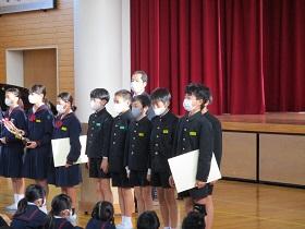 今日の1限目に全校集会&児童集会を行いました。はじめに、いしかわっ子駅伝大会(男子7位・女子3位)と「親子の手紙」優良賞の表彰を行いました。続いて学校長と生徒指導の係から人権週間について話をしました。特にいじめが許されないものであることを再度伝えました。その後、体育委員会より、なわとびの技の紹介を行い、今月の歌「もみじ」をマスク着用で歌いました。