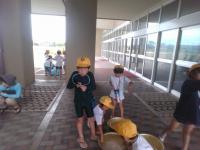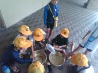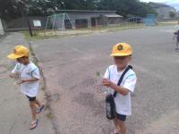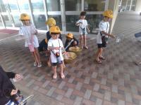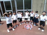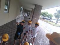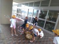 ストローやうちわ,針金などで小さなしゃぼん玉や大きなしゃぼん玉を作り,みんなで遊びました。その後,ペットボトルの水でっぽうも楽しんでいました。思い切り遊んだあとは,プールに入り,とても楽しい時間になりました。