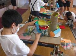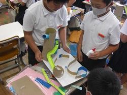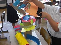 4年生は、今,図工科で、ビー玉を転がして遊ぶためのタワーを創作する「コロコロガーレ」に取り組んでいます。カラフルな色段ボール紙を丸めたり、つなぎ合わせたり、ビー玉の転がり方を見て修正したりしています。とても楽しそうで、集中しています。もうすぐ完成のようです。