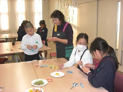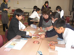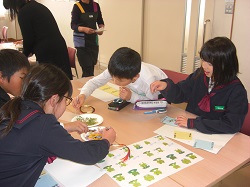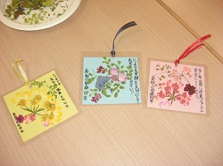 4年生は昨日、一人暮らしのお年寄りの方に届けようと、押し花の飾りを作りました。押し花のインストラクターのみなさんにご協力いただき、材料を準備していただき、作り方を教えていただきました。