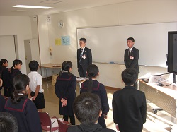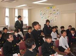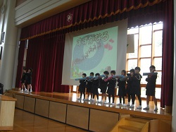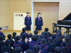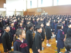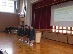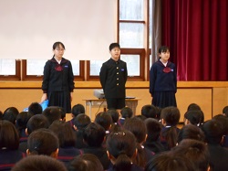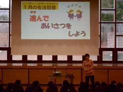 1限目の始業式では、十二支についての話や、いじわるをしないこと、3学期が次の学年へのステップであることなどを話しました。その後生活目標として「進んであいさつをしよう」の説明を行いました。児童会からは、ユニセフ募金のお願いがありました。