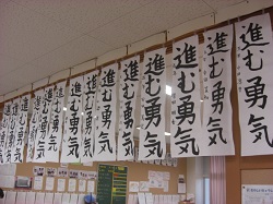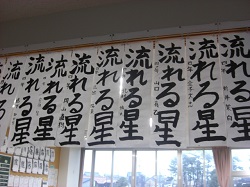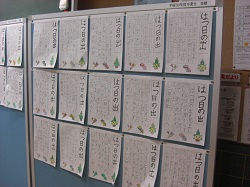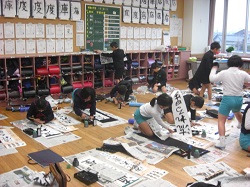児童は、冬休み中の練習の成果を生かし、慎重に、そして力強く書いていました。作品は教室前に掲示され、力作が勢揃いしました。