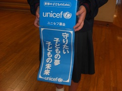 ユニセフは、世界の子どもたちの生命の安全、生活、教育等のために活動する国連の機関であり、本校では、ユニセフの活動に協力するために今週1週間、募金活動を行っています。