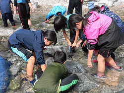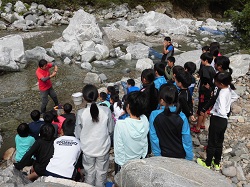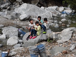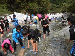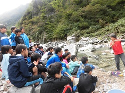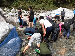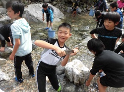 合宿2日目です。朝食の後の午前の活動は、「イワナつかみ」です。自然が残る川に移動し、岩場に潜むイワナを手で捕まえて、食します。人間は、動植物の命をいただいて生きていることを体験し、恵みに感謝するという活動です。