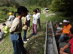子どもたちは、懸命にイワナを追いかけていました。