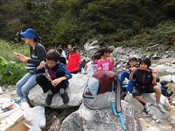 イワナを捕らえた後は、焼いて食するために、自分でさばいて串を通します。これもなかなか簡単にできるものではなく、勇気と覚悟が必要です。子どもたちは思い切って挑戦し、最後は、骨の部分まで余すことなく、おいしくいただくことができました。「生きる」ことの一端にふれた学習でした。