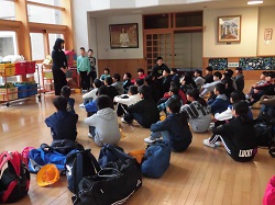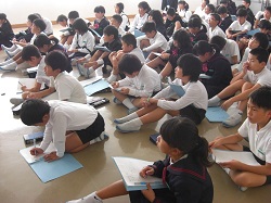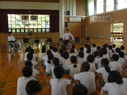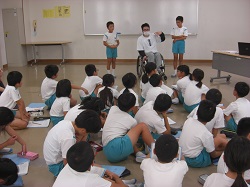 4年生の福祉学習で、今日は、「車いすバスケットボール」を体験しました。講師は、車いすバスケットボールクラブ「jamaney石川」の岩崎さんと北風さんです。車いすの乗車、普段の生活についての学習、競技体験などがありました。